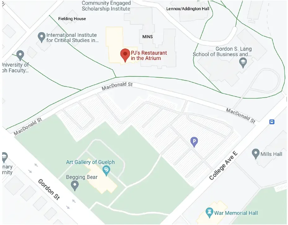 PJ's is located on the north side of the University of Guelph campus inside of MacDonald Steward Hall off of Gordon St. and College Ave E.